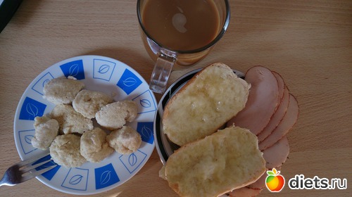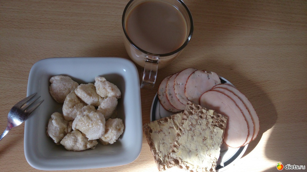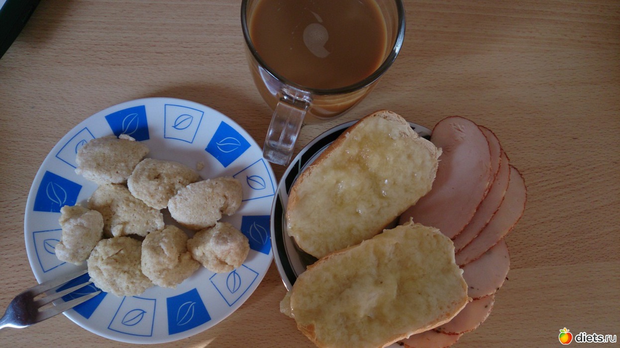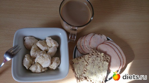 Завтрак: ленивые вареники с отрубями, кофе с молоком и кубиком сахара, хлебцы с маслом сливочным и колбаски из куриного филе