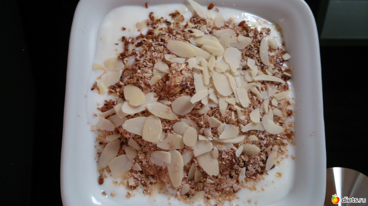 Ланч: йогурт с грушей, льняными семенами, отрубями пшеничными и миндальными хлопьями