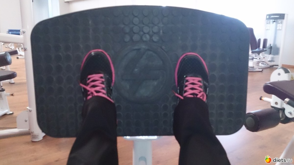 Были и другие на пресс с поднятием ног, корпуса и боковые подъемы, а также силовые на бицепсы, заднюю сторону рук, "бабочка" на выпрямленных руках, толкание ногами железа (на фото ноги мои) и еще несколько других. В следующий раз сфоткаю тренажеры и точно уже напишу сколько и на каком я сделала)))))