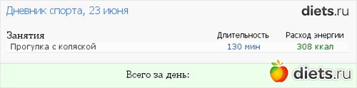 Из спорта только двухчасовая прогулка с дочей и с коляской (все время ходила), ну и уборка по дому, вытирание пыли и пр...