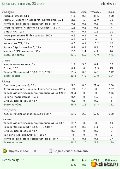 Вчера устала ужасно, поэтому даже лень было отчет писать, поэтому пишу сейчас, с утра, с новыми силами. Сегодня я в плюсе и довольно неплохом, но надеюсь, что это по большей части вода, вчера я ее вроде больше 2л выпила...