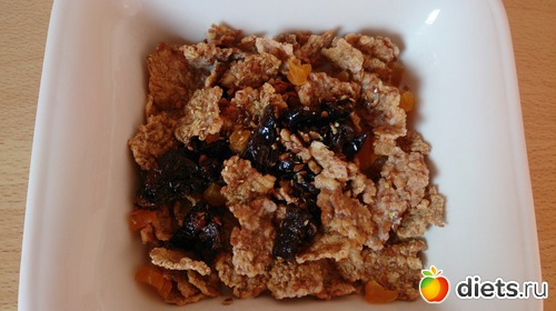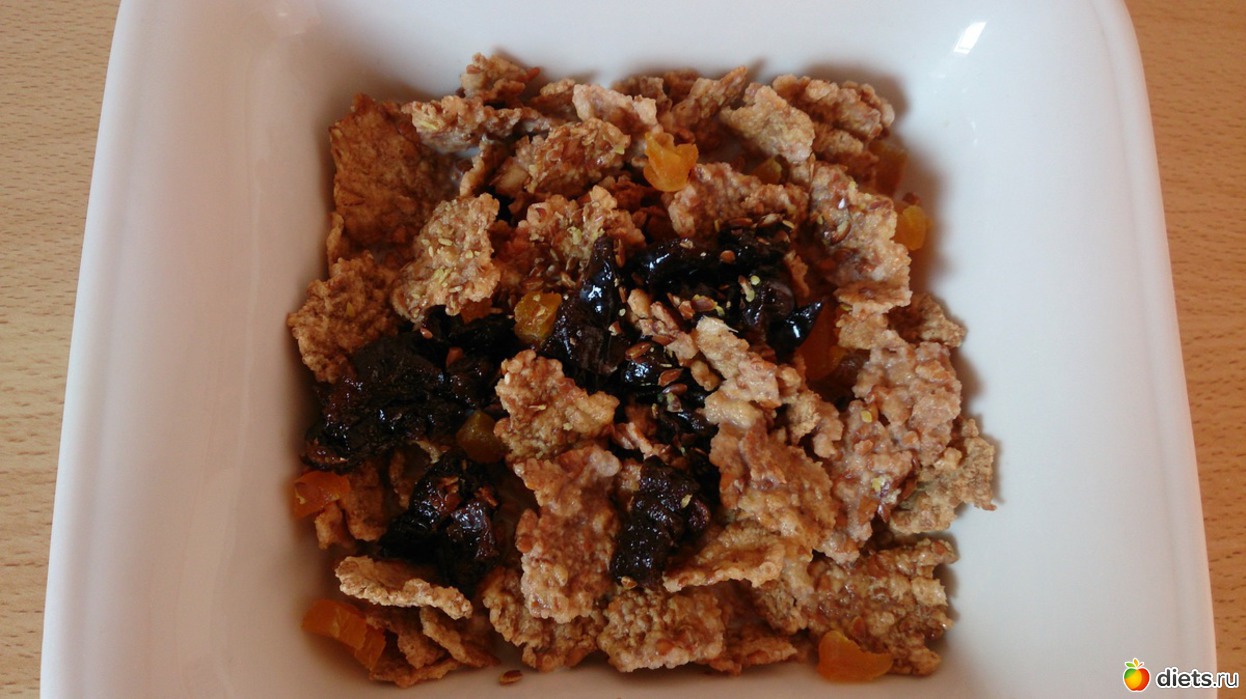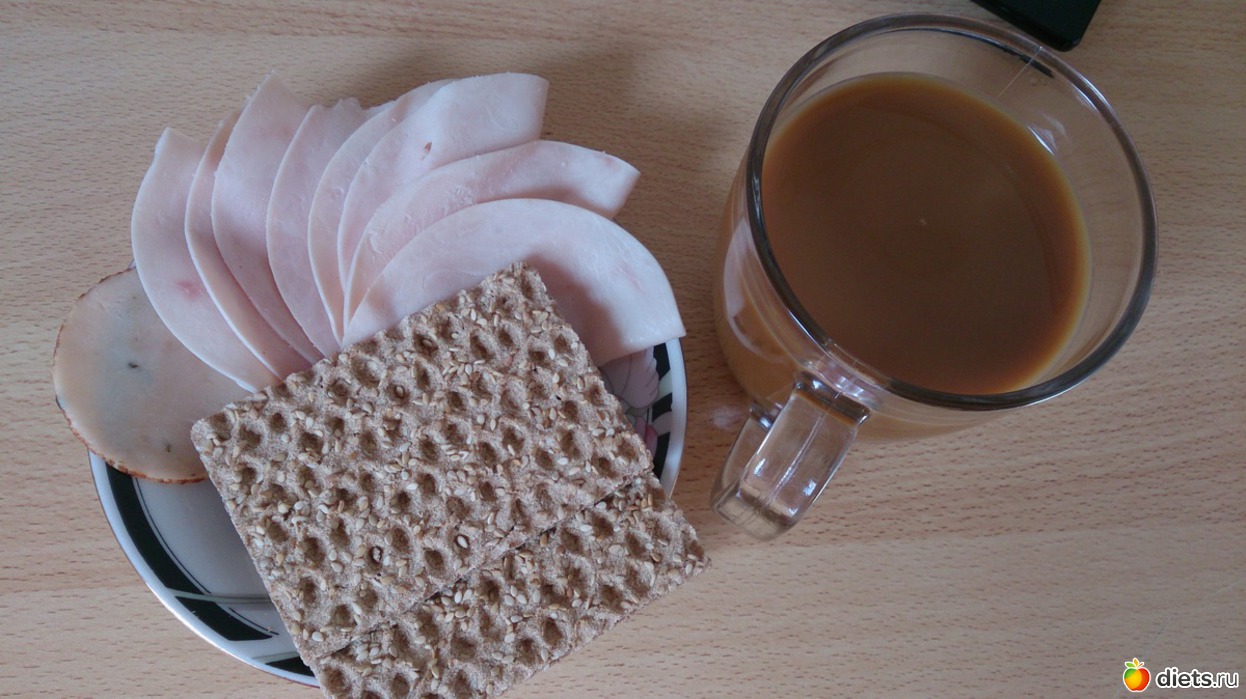 Завтрак: хлопья с молоком, льняными семенами, курагой и черносливом, кофе со сливками и кубиком сахара, хлебцы и куриная, индюшиная колбаска