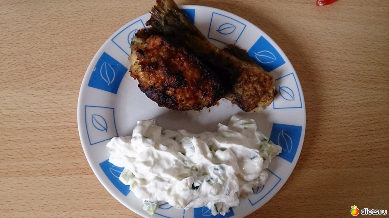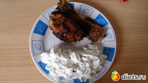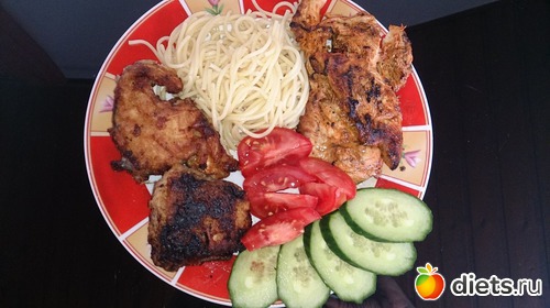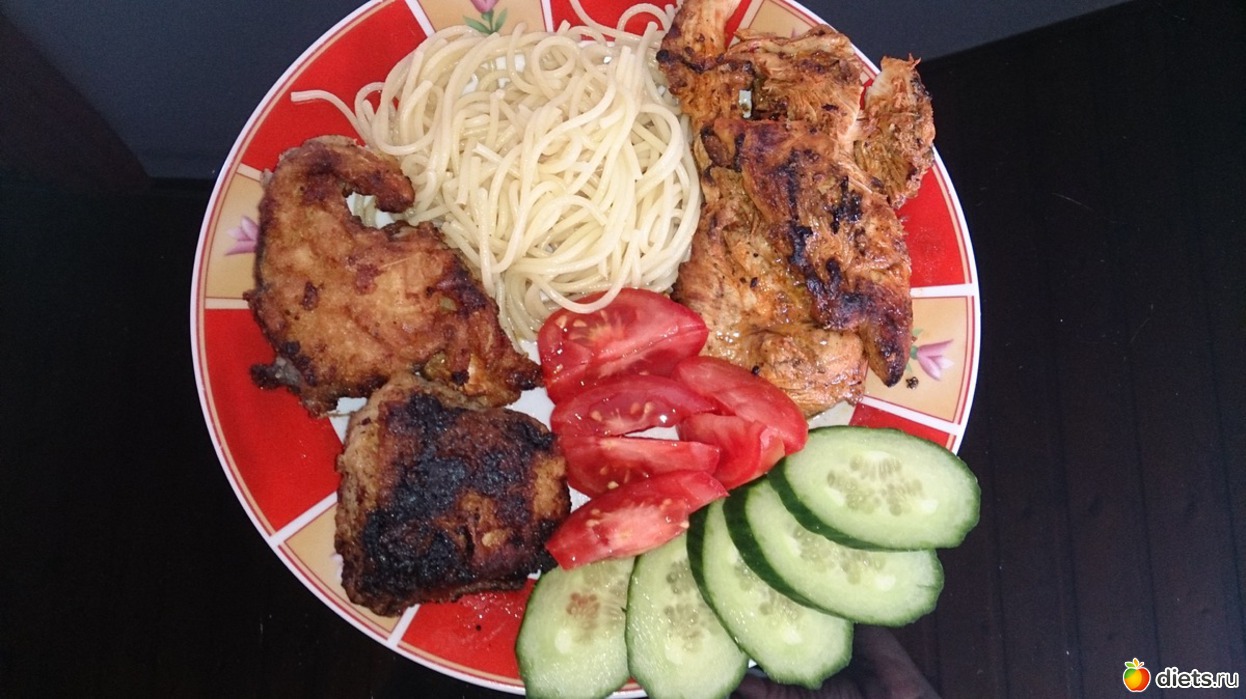 Обед: спагетти, томаты, огурец, куриное филе на грилле, жареная мужем рыбка (смотрел футбол и жарил, поэтому такая черненькая