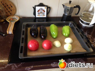 Ставим в духовку на 180 градусов. У меня нижний подогрев и гриль. Но обычный подогрев верх-низ тоже подходит. В идеале, перец и помидоры можно вытаскивать через 20 минут, тогда они будут более плотненькие. Но в этот раз я достала все вместе, так что овощи все были мягкие-мягкие. Баклажаны запекаются у меня около 40 минут. Можно проверить - проткнуть вилкой, если мягкие - значит готовы.