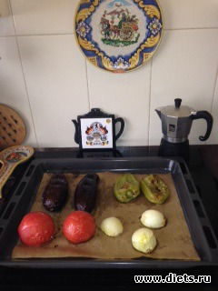 Овощи моем, смазываем капельку оливковым маслом (можно и без него, но я люблю так), баклажаны протыкаем в нескольких местах вилкой, выкладываем все на противень. Я предварительно кладу бумагу для выпечки.