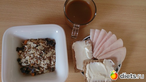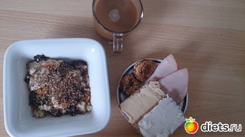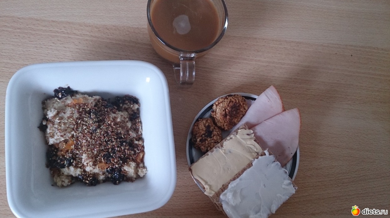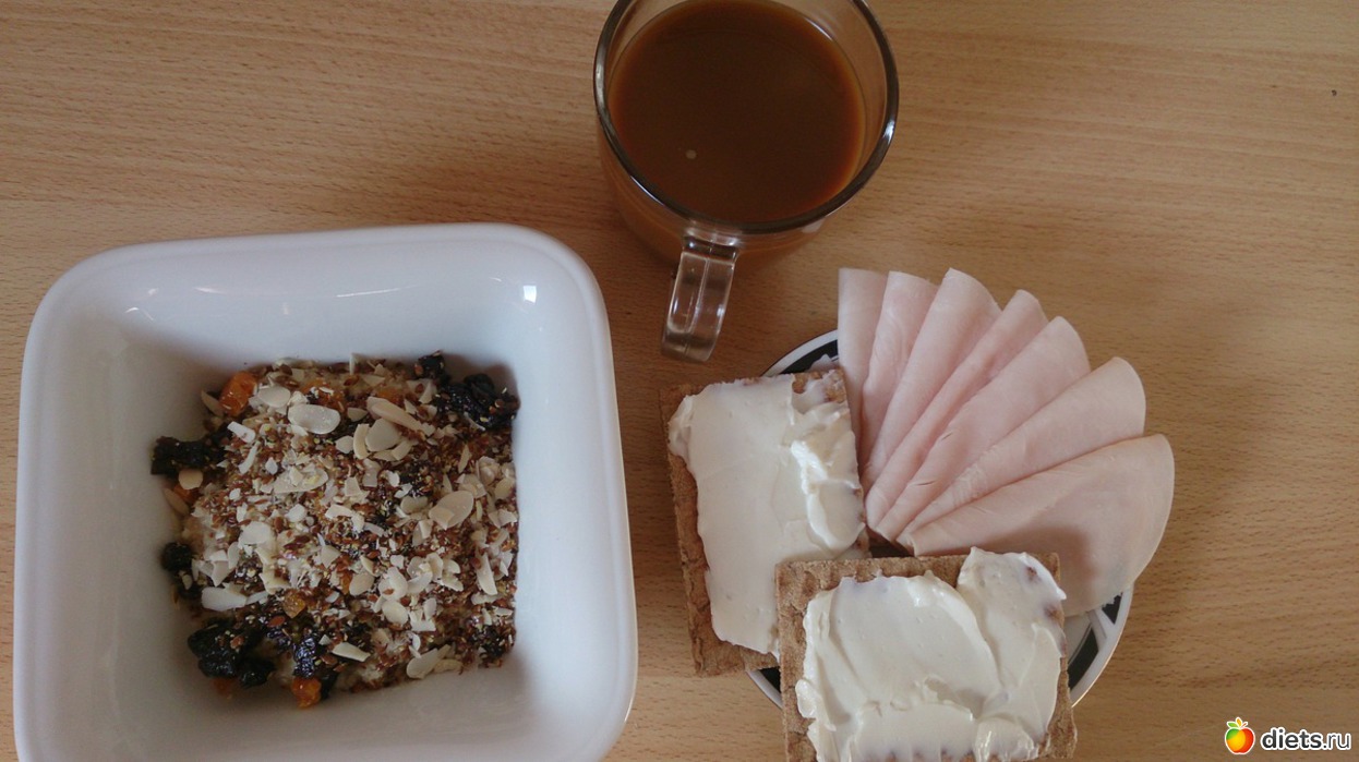 Завтрак: овсяная каша на воде со сливочным маслом, льняными семенами, курагой, черносливом, хлебцы с маслом сливочным и филадельфией, колбаса