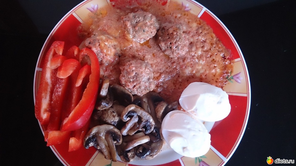 Обед: фрикадельки со смешаного фарша с томатно-сметанным соусом с сыром, яйцо вареное с филадельфией, жареные шампиньоны, красный перец