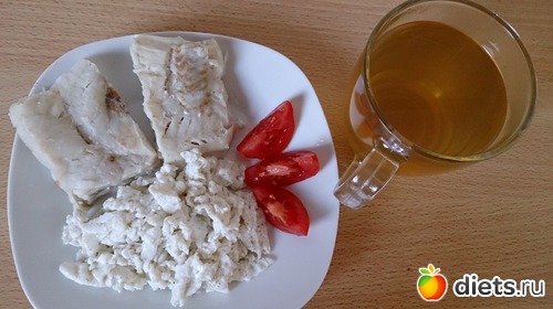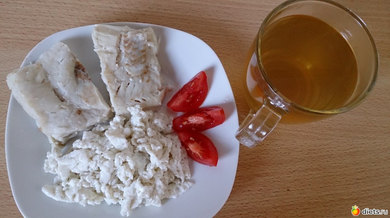 Ужин: рыба, белок жареный, томат, зеленый чай