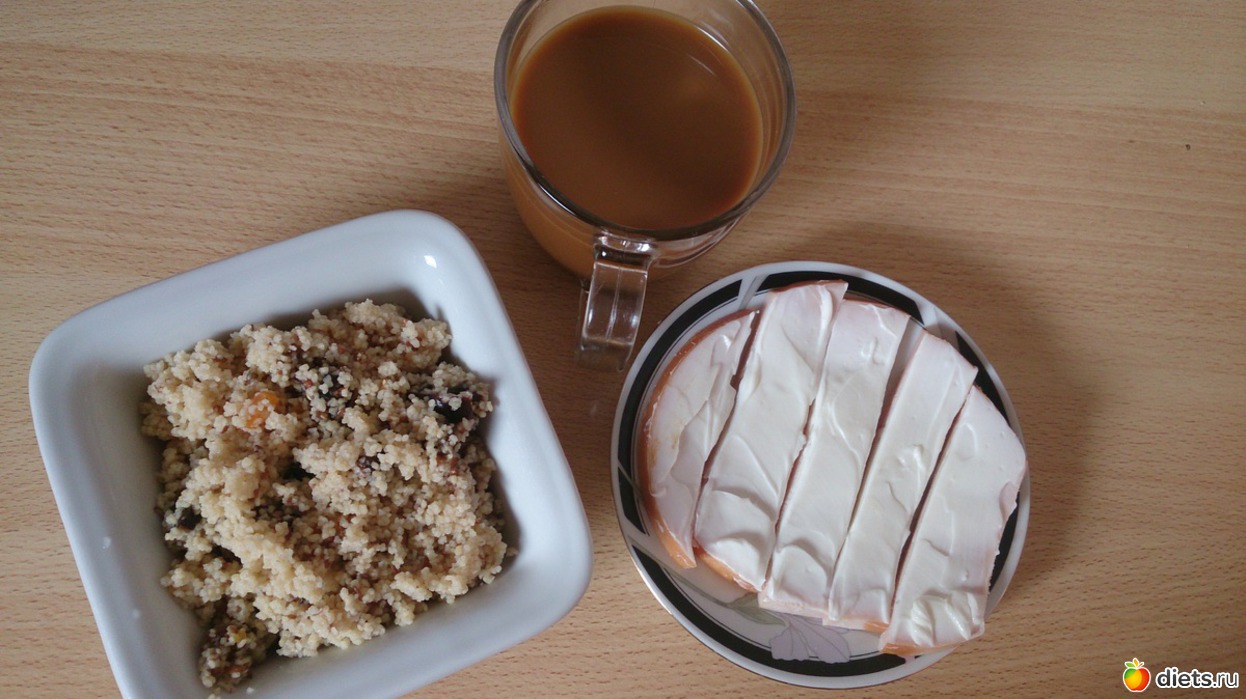 Завтрак: кус-кус на воде, с курагой, инжиром, черносливом и семенами льна, кофе с молоком без сахара, ветчина куриная с филадельфией
