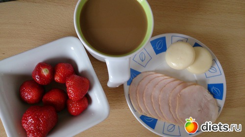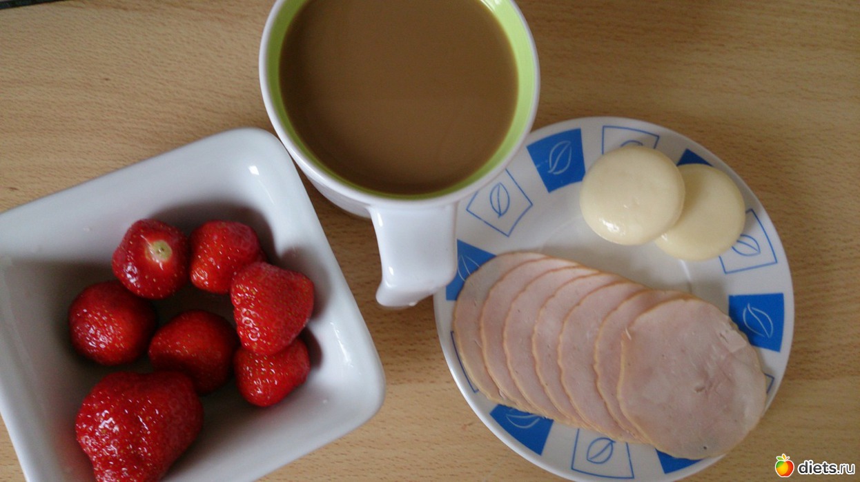 Ланч: клубника, кофе с молоком без сахара, сырки, индюшиная колбаса (ветчина)