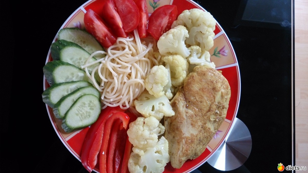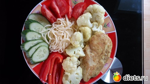 Обед: (оооо, наелась) спагетти, куриное филе тушеное, цветная капуста, томат, огурец, сладкий перец