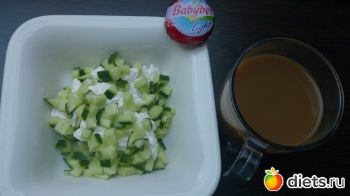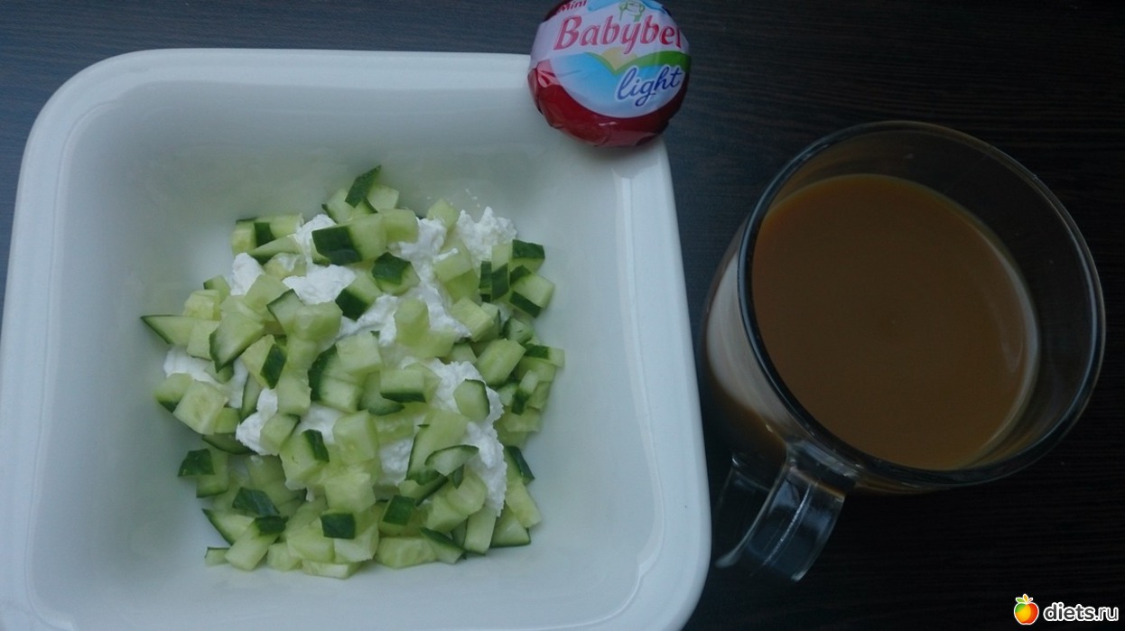 Ужин: творог с огурцом, сырок и кофе с молоком без сахара