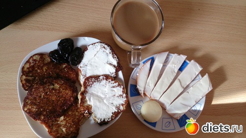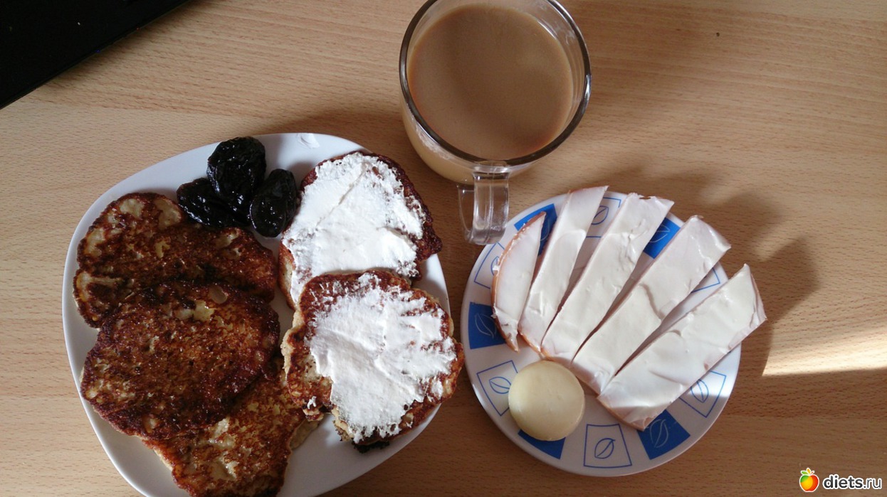 Завтрак: панкейки овсяные с медом, сметаной, чернослив, кофе с молоком б.с., колбаса-ветчина куриная с филадельфией