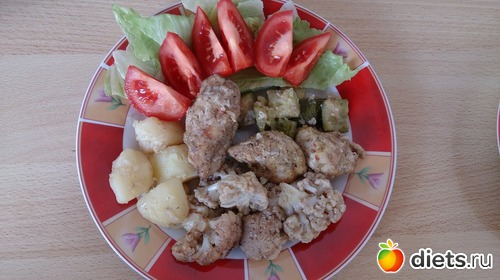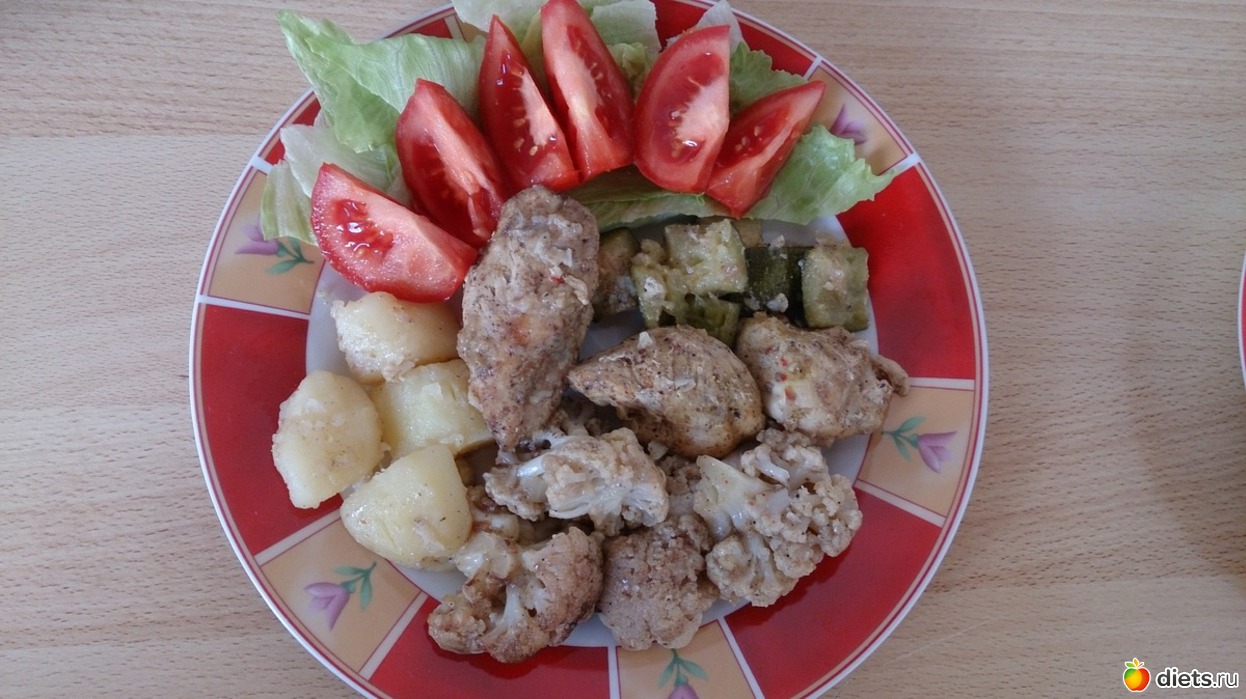 Обед: тушеные куриное филе с картошкой, цветной капустой, цуккини, томат, салат Айсберг