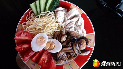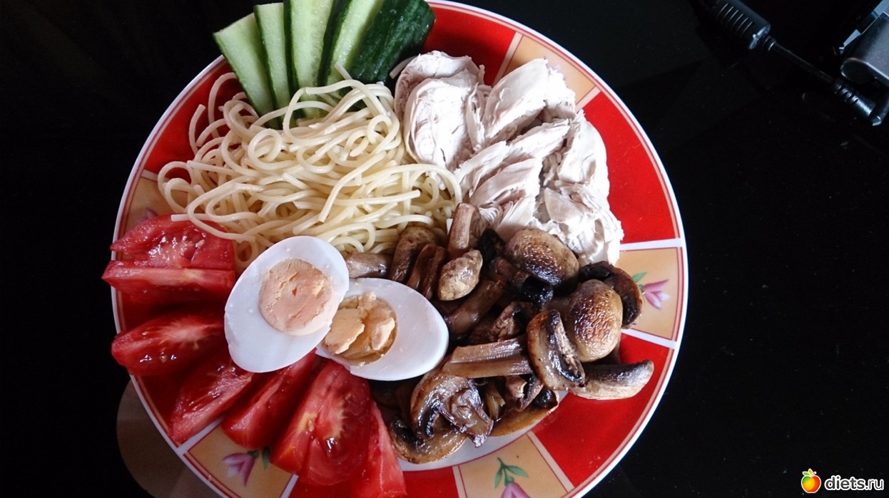 Обед: спагетти, шампиньоны жареные, филе куриное, томаты, огурцы, яйцо вареное