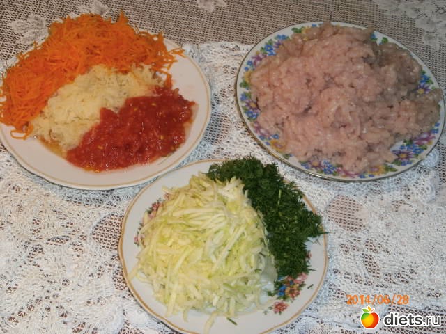 5. В фарш добавляем кабачки, морковь, лук, картофель, помидор, укроп, яйцо, 5 ст. л панировочных сухарей и все перемешиваем, солим и перчим по вкусу (солим в последнюю очередь)