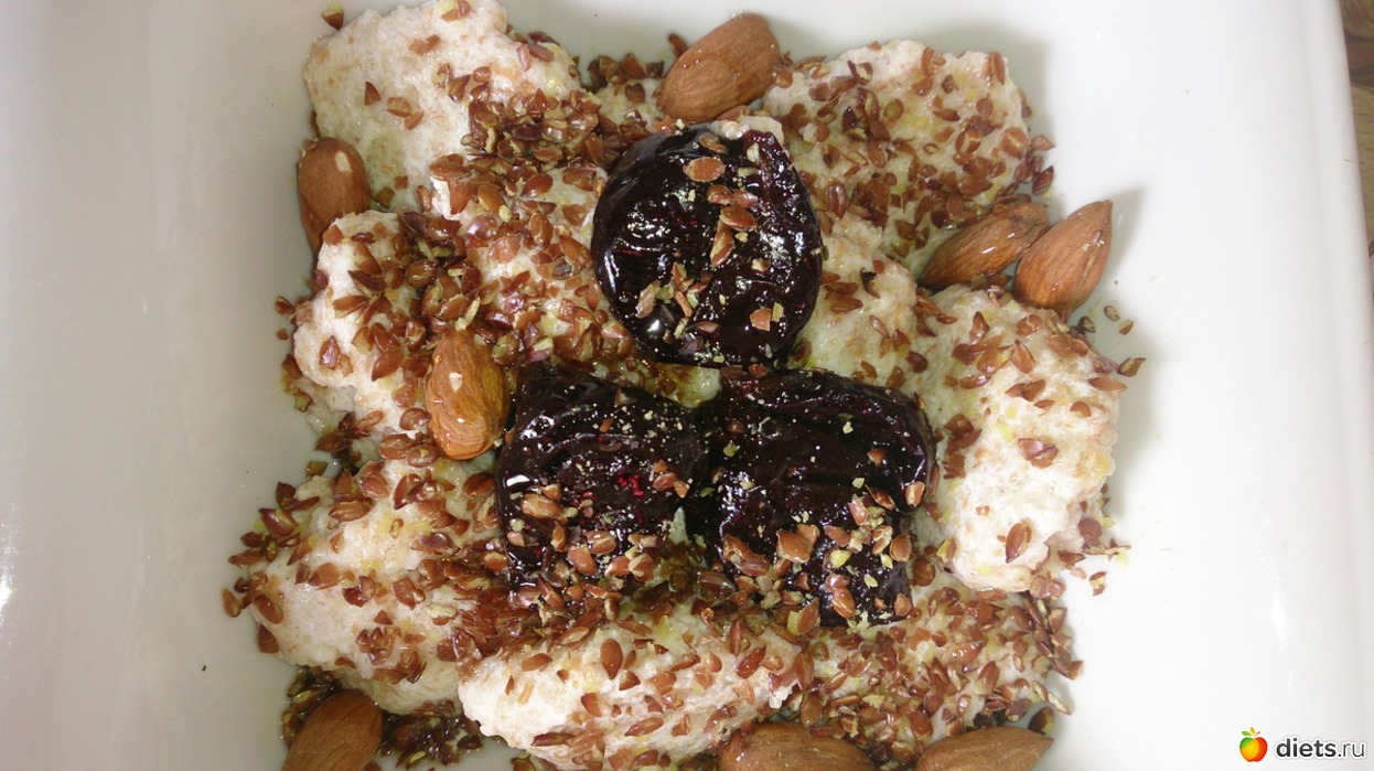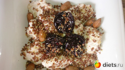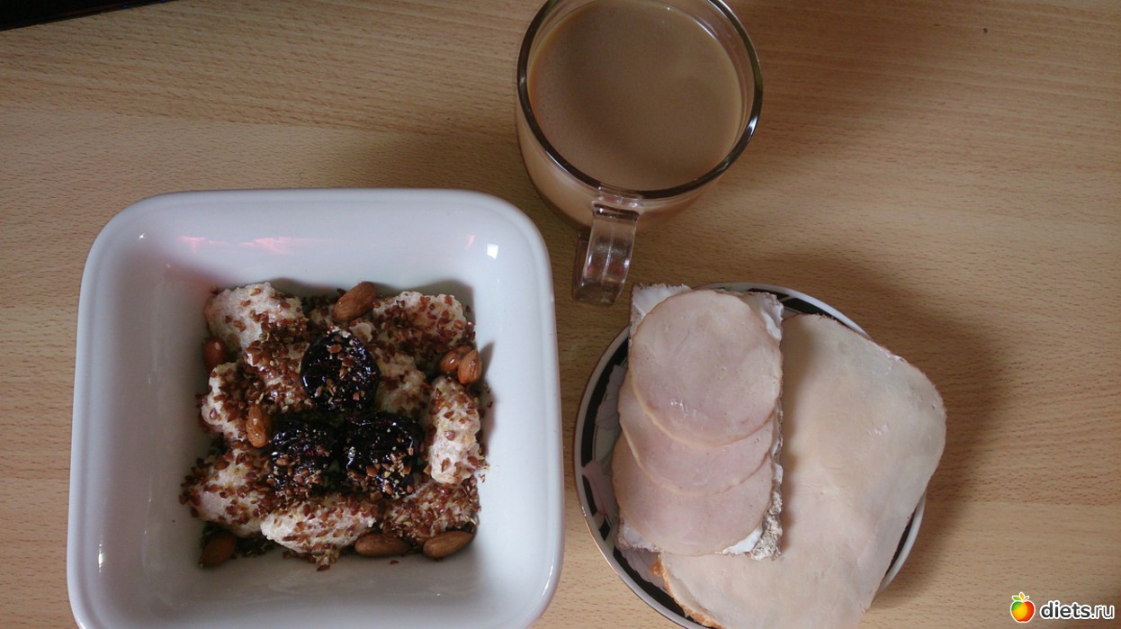 Завтрак: ленивые варенички со смешаными отрубями, льняными семенами, миндалем, черносливом, кофе с молоком, хлебцы с филадельфией, куриная и индюшиная колбаски