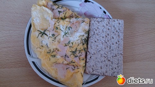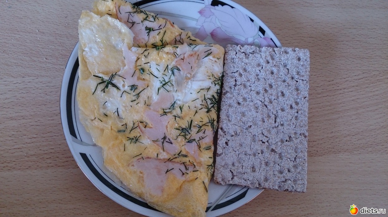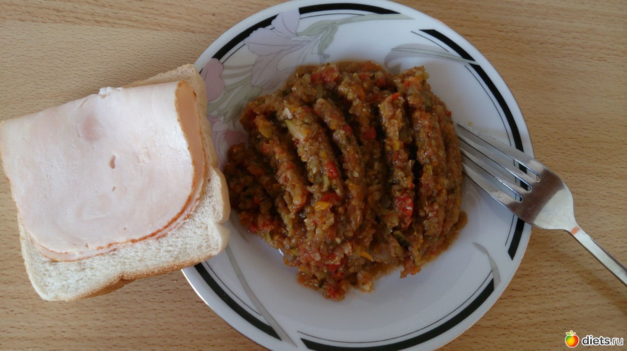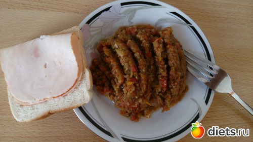 Обед: (ужасно сосал желудок, а то, чем хотела пообедать еще не было готово, поэтому обед такой) сначала икра овощная, хлебушек, колбаса куриная, потом омлет с колбаской, укропом, хлебец