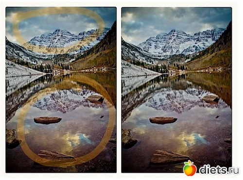 Движение линии, создающий округлые формы, имеет особенную энергетику, а также направляет взгляд внутрь кадра. Можно использовать круги или полукруги чтобы создавать композицию кадра. На нашем примере эти геометрические фигуры притягивают взгляд зрителя в глубину картины, к отражению на воде и далеким пикам.