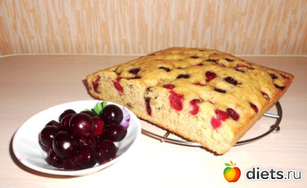поверхность готового пирога остаётся глянцевой и не сильно румянится, так что ориентируйтесь на сухую палочку, не передержите, а то пирог получится сухим. И ещё, орехи сильно не мельчите, вкусно, когда они чувствуются. В принципе, этот пирог можно испечь с любыми фруктами-ягодами, но с вишней вкуснее всего. Хотя сам масляный бисквит очень хорош и без всего.