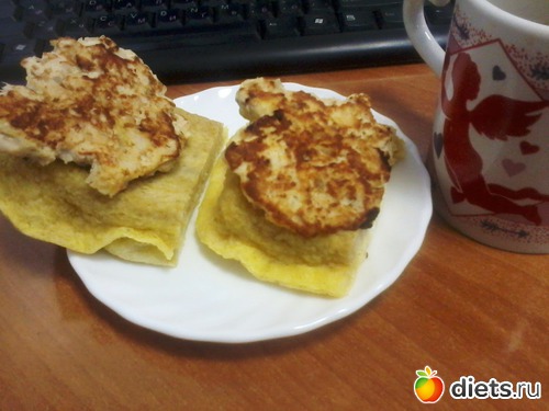 Завтрак: Бутерброд Дю (хлеб Дю + рубленые котлетки из курогрудки) + кофе с молоком