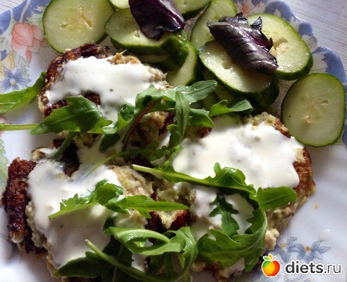 Готовила так: 500 г кабачка потерла, добавила 150 г творога, 1 яйцо, 1 ст.л. клетчатки, 1 ст.л. муки, зелень, соль, перец; ложкой выложила на смазанную 1 ч.л. подсолнечного масла тефлоновую сковороду, пекла под крышкой. Если будете повторять "подвиг", не забудьте отжать кабачки, а то будете, как я, ждать, пока сок выпарится.