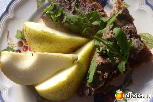 Полдник - тосты с домашним печеночным говяжьим паштетом и 1 ч.л. сливочного масла, грушка.