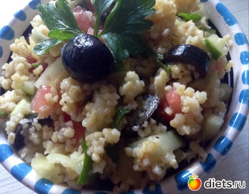 Готовила так: 125 г пшеничной крупы (пакетик) сварила и остудила, добавила порезанные мелким кубиком огурец, помидор, сладкий перец, репчатый лук, колечки маслин, заправила чесноком, мятой, петрушкой, лимонным соком и оливковым маслом, посолила, поперчила.