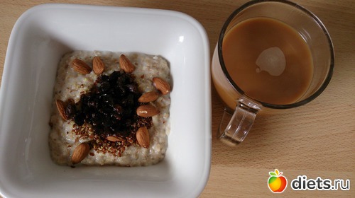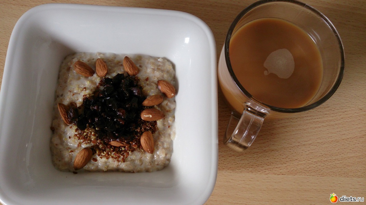 На завтрак: неизменная практически овсянка на молоководе, с черносливом, льняными семенами, миндалем и пол ч.л. оливкового масла, кофе со сливками