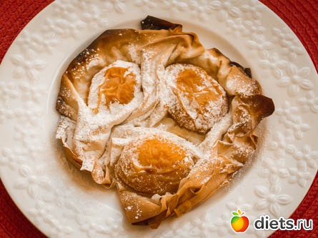 Нам понадобится 4 листа теста "фило", 6 абрикосов, 4-6 гр. сахарной пудры, и 8 гр. растительного масла.