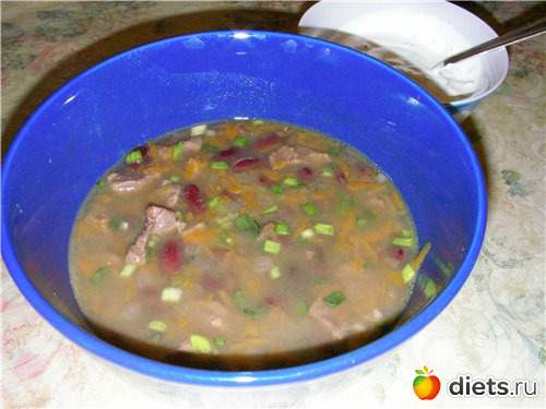 Если готовим в мультиварке - все сразу обжариваем в ней, если будем готовить суп в горшочке - обжариваем все на сковороде, а затем укладываем в горшочек. Лук мелко режем, обжариваем в режиме "Выпечка", затем добавляем морковь, тертую на крупной терке, затем порезанное на небольшие кусочки мясо. Красную фасоль предварительно на ночь замачиваем в холодной воде, ставим в холод. Если фасоль в банке, промываем ее проточной холодной водой. Фасоль и картофель (порезанный на крупные куски) добавляем в суп вместе с лавровым листом, добавляем воды такое количество, чтобы оно немного накрывало все продукты, включаем на "Тушение" на 1 час. Затем достаем картофель и натераем его на терке либо давим его, обратно добавляя в суп. Включаем режим "Варка на пару" на 10 минут, добавляем мелко порезанную зелень и подаем. Суп получается очень насыщенным и густым.
