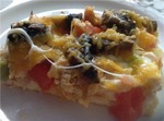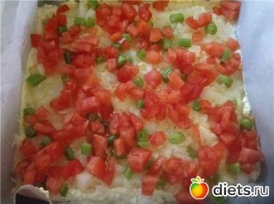 Выливаем его в антипригарную форму или силиконовую, можно выстелить бумагой для выпечки. На него мелко порезанный лук+помидоры+перец, грибы, мяско ( курица) и покрываем сыром!!!