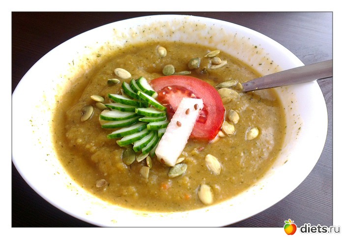 полстакана гороха половинками замочить на ночь, так быстрее готовится. утром промыть, залить водой и варить до тех пор пока не начнет развариваться. добавить лук кубиком, 1 ст л томата и специи по вкусу. поварить до готовности лука, снять с огня. взбить блендером с парой зубчиков чеснока. посыпать рубленой зеленью и тыквенными семечками.