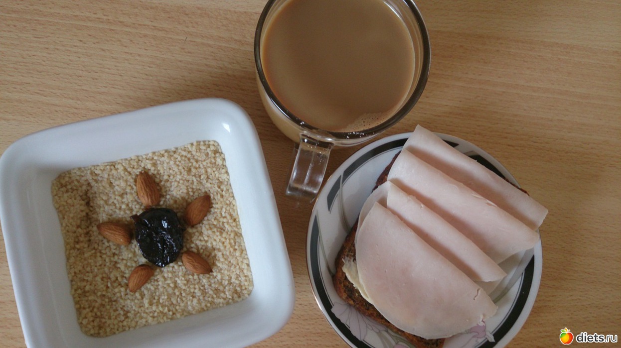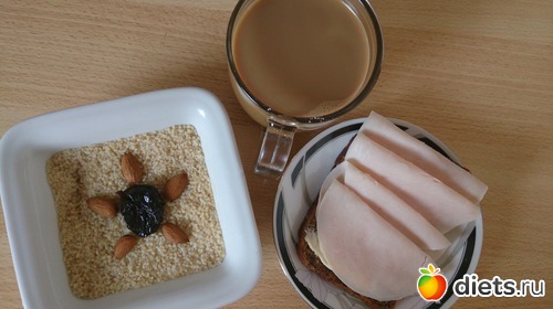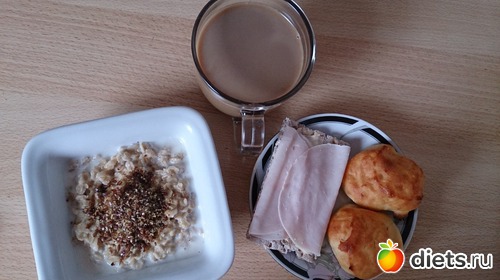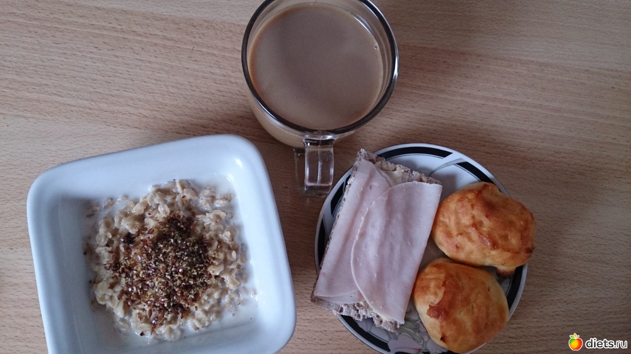 На завтрак: каша овсяная на молоководе с льняными семенами, медом, хлебец со сливочным маслом и ветчиной, два сырника с духовки, кофе с молоком