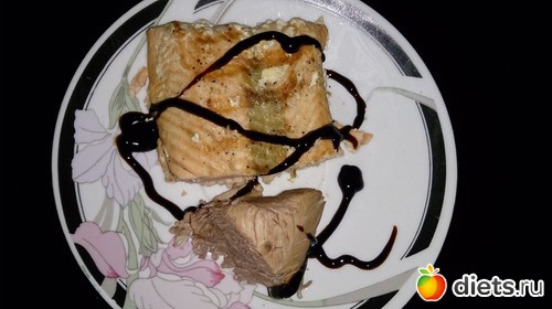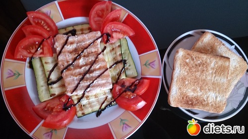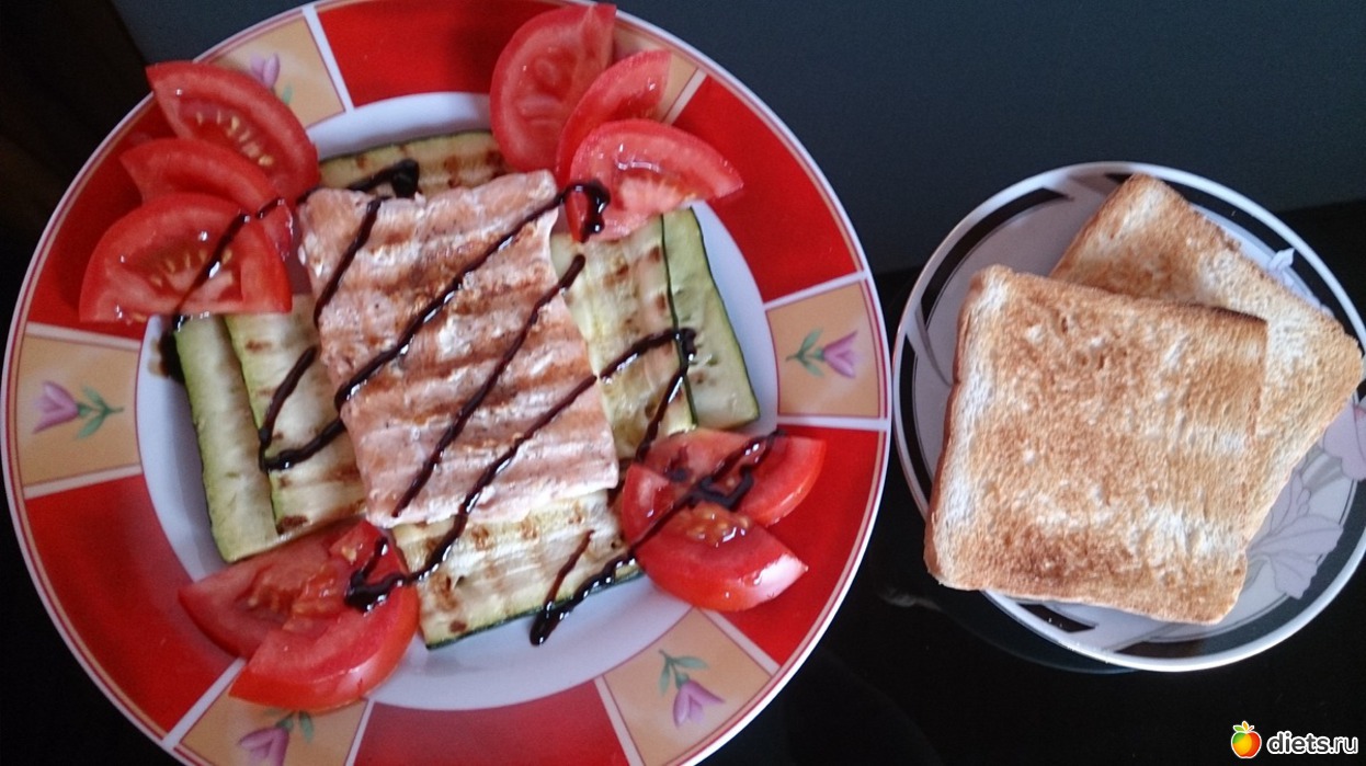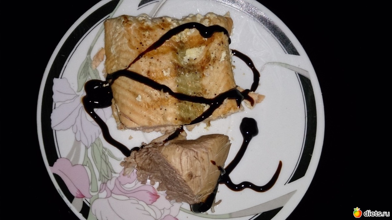 Ужин: тоже получился поздним, в 9 вечера, но только белок рыбки кусочек и кусочек последний индюшиного филе с супа дочиного, политые чуточкой бальзамика