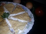 Нагреть антипригарную сковороду и влить белок. ЖАРИТЬ ДО подрумянивания, затем перевернуть. Готовый омлет выложить на тарелку( доску), дать ему остыть. Разделить на 4 части и на каждый тругольничек намазать творожную массу с зеленью и свернуть.