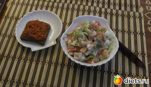 1. Салат из томатов, яйца и сладкого перца (томаты, яйцо, сладкий болгарский перец, майонез).