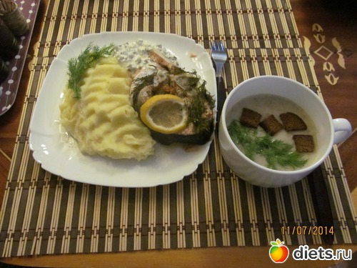 2. Запеченная семга со сметанным соусом (семга, лимон, специи для рыбы, сметана, маринованные огурцы) с гарниром из картофельного пюре (картофель, масло сливочное, сливки).
