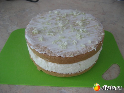 Остывший бисквит разрезаем вдоль на 2 части, делаем высокие бортики, выкладываем 2/3 крема, накрываем второй половинкой и сверху оставшийся крем.