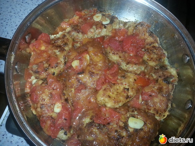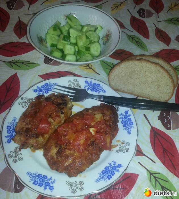 Обед-тушеные котлеты в томатной подливе, и салатик из помидорок и огурчика,1 кусочек хлеба.