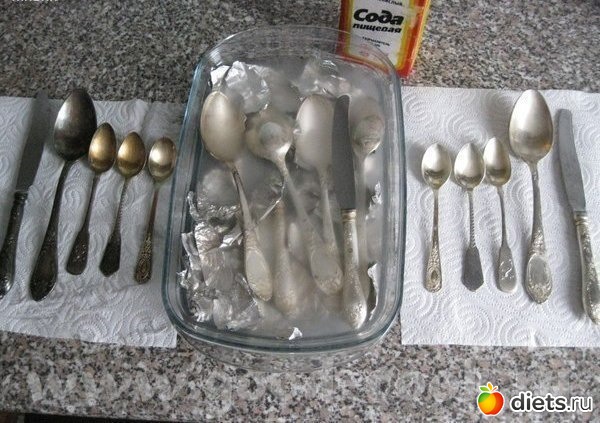 Как почистить серебро при помощи фольги? Берем то изделие, которое собственно и нуждается в чистке. Кладем его в чашку или пиалу (керамика). Добавляем чайную ложку соли и кусочки скомканной фольги либо кладем фольгу на дно посуды. Размер фольги при этом должен быть не меньше ладошки. Заливаем водой серебро, соль и фольгу. Ложкой перемешиваем и ждем. Уже спустя пятнадцать минут ваше колечко, ложка или что вы там отправляли на чистку, полностью освободится от темного налета, станет светлым и таким же красивым, как только купленное.