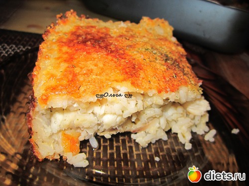 Рис промыть и отварить в подсоленной воде до полуготовности. Воду слить и дать рису немного остыть, можно переложить его в глубокую тарелку. Сыр натираем на мелкой терке, хотя это не имеет особого значения, можно воспользоваться крупной, и отправляем 1/3 часть в тарелку с рисом, где всё хорошо перемешиваем. Если филе рыбы заморожено, то дать ему оттаять. Затем рыбу посолить и поперчить по вкусу, можно сбрызнуть соком лимончика. Затем берем жаропрочную форму, в которой будем готовить, и начинаем выкладывать слоями будущую запеканку. Для начала нужно разделить получившуюся сырно-рисовую массу поровну и одну половину выложить ровным слоем в форму. На этот слой положить рыбу. Поверх рыбы положить вторую половину сырно-рисовой массы. Молоком полить запеканку и сверху посыпать оставшимся сыром. Ставим запеканку в разогретую до 180 градусов духовку на 40 минут Как только запеканка подрумянится, достаем её из духовки. Уже готовое блюдо можно посыпать мелко нарезанной зеленью Приятного аппетита!