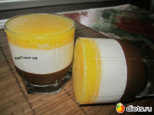 Делаем 3 вида желе. Чернослив измельчаем погружным блендером, добавив немного воды. 5-7 гр. желатина приготавливаем так, как написано на упаковке, тщательно смешиваем с черносливом, выливаем в форму и ставим в холод, для полного застывания. Так же делаем творожное желе, только творог немного разбавляем ряженкой или молоком. творожный слой выливаем поверх чернослива и опять в холод, для застывания. И наконец делаем апельсиновое желе, его ничем разбавлять не надо, и так жидкий. Выливаем сверху, на творожный слой, в холод, как застыло- так готово. Красиво и вкусно! Готовить лучше с утра, т.к. занимает не мало времени. Приятного аппетита!