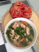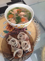 О- уха из горбуши и бутерброд с селедкой, возможно салат из огурцов и помидор