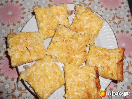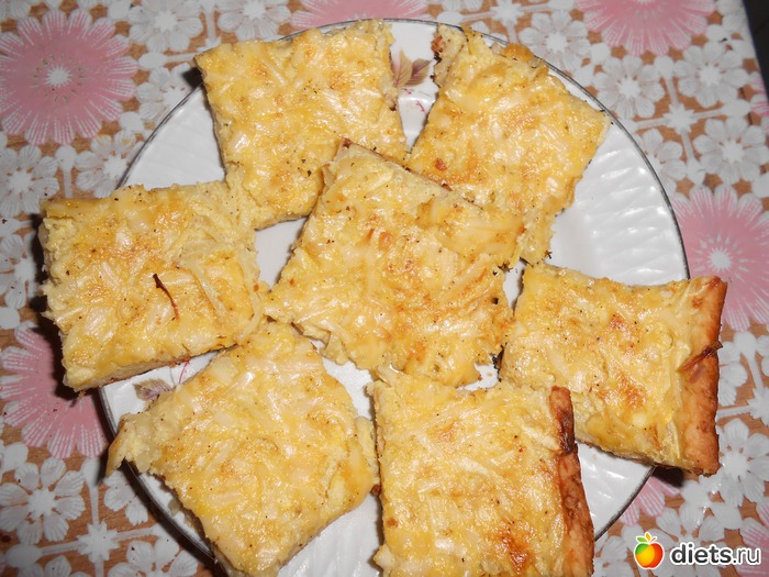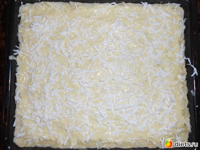 3.Вынуть тесто, раскатать тонким пластом. Уложить в форму, приподняв края. Теперь добавить цуккини, полить заливкой и посыпать все сыром.