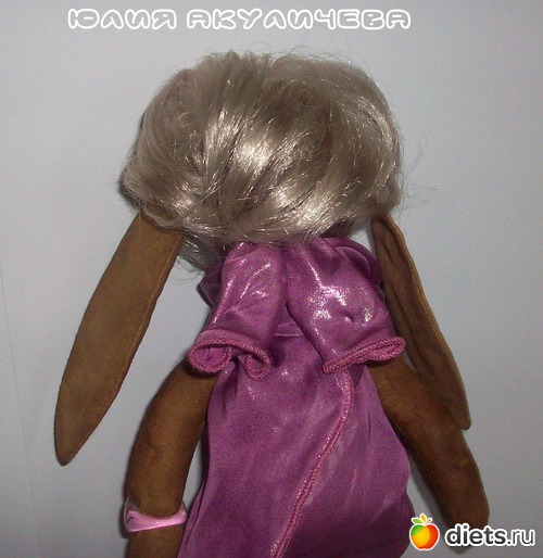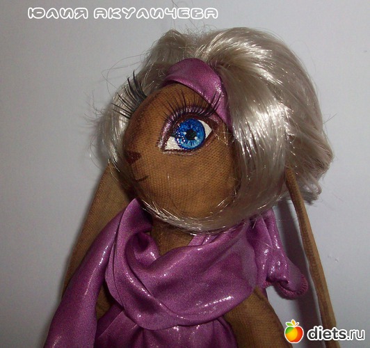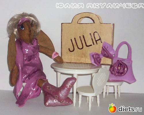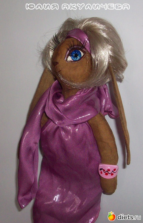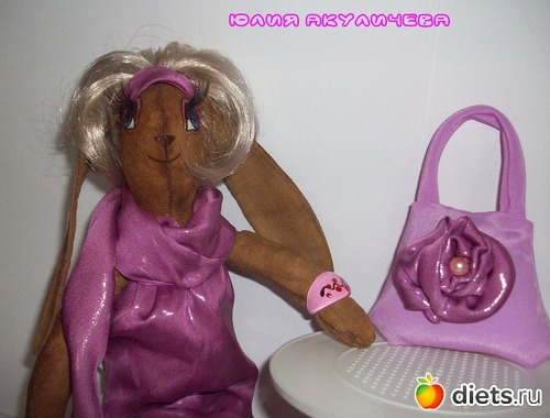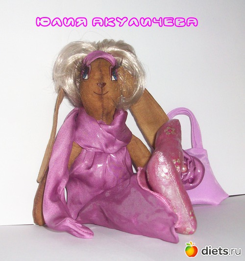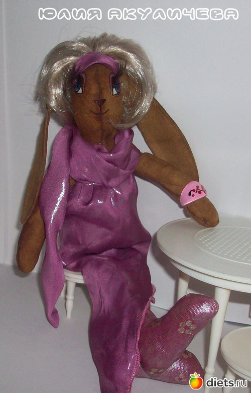 Гламурная Мисс N…. Большая любительница шопинга и светской жизни. Приобрела для своей новой хозяйки небольшой подарок сюрприз, который находится в бумажном пакетике, также в пакетике паспорт игрушки. Зайка сшита из окрашенной бязи( кофе, корица, ваниль), одета в роскошное розовое платье из мокрого шёлка(одежда не снимается), причёска зайки украшена повязкой из аналогичной ткани. На лапке - пластиковый браслет. Ножки в коленочках сгибаются. Глазки и обувка –ручная роспись художественными акриловыми красками. Сумочка сшита из двух видов ткани, мокрого шёлка и крепдешина, украшена розой и бусиной. Пакет сделан из бумаги, окрашенной вручную (кофе, корица, ваниль) и надписью JULIA (Юлия), в пакете: подарок - сюрприз ручной работы. Сшита на продажу.