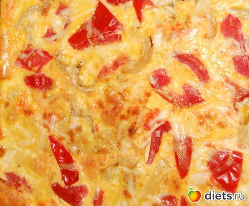 Поверх раскладываем дольки помидоров, посыпаем все сыром.