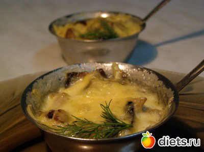 Моем и режем шампиньоны на тонкие пластинки, мелко крошим репчатый лук. Разогреваем сковороду туда добавляем масла (любое - хотите растительное, хотите сливочное). На разогретой сковорде пассируем лук до золотистого цвета. После добавляем шампиньоны и переодически помешивая. Жарим шампиньоны почти до готовности. При жарке образуется жидкость ее надо слить. Как только шампиньоны почти готовы добавляем сметану. Все это как следует мешаем. И чуть выпариваем сметанку. Затем туда наливаем сливки. Мешаем, до тех пор пока сливки не выпаряться. Как только сливки выпарились, грибы готовы. Посолить по вкусу. Теперь берем кокотницы (или любую другую форму) и расскладываем грибы. Кокотницы заполняем на две трети. Остальное засыпаем сыром. И ставим на протвень налив в него немного воды (кокотницы стоят немного в воде). Убираем в духовку минут на 10-15 чтобы сыр расплавился. И все, можно есть
