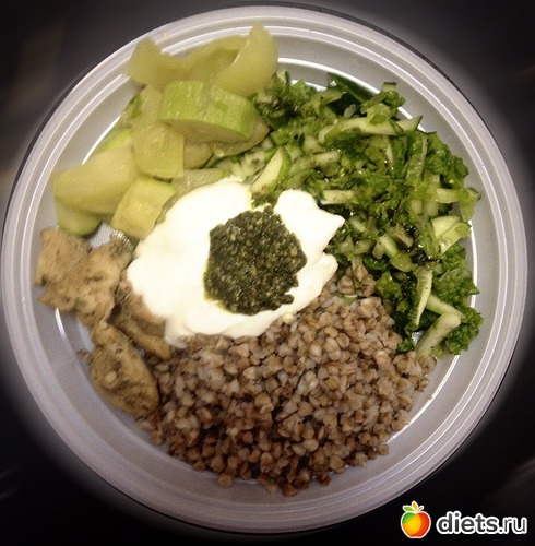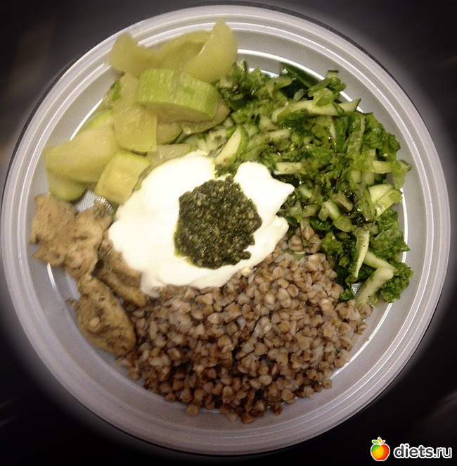 Углеводы: гречка, залитая горячей водой в термосе за 2 часа до еды (100 гр. готовой каши)