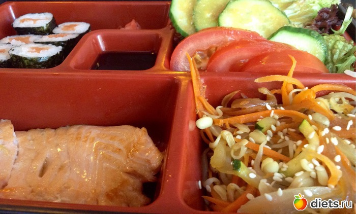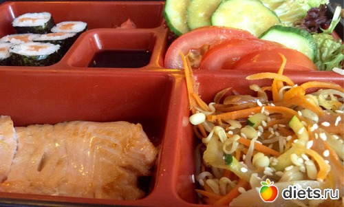 Обед - бенто-ланч с лососем, тушеными ростками сои с овощами, зеленым микс-салатом и роллами (примерно 75 г риса)
